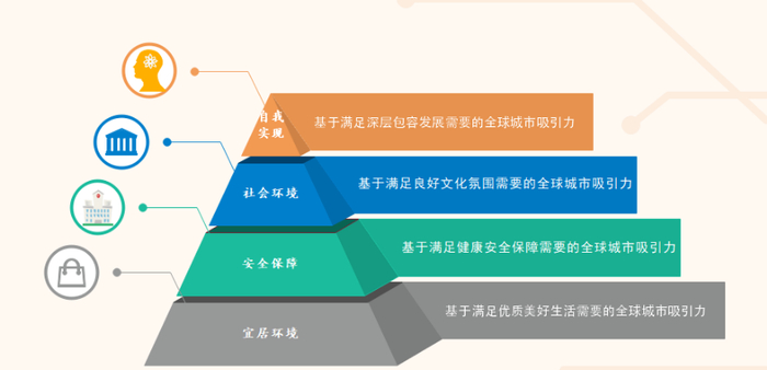 我们从满足创新类人才需求角度出发,营造城市舒适度为目的,构建了宜居环境、安全保障、社会环境和自我实现4个一级指标、12个二级指标的全球城市吸引力评价模型(图1)。
