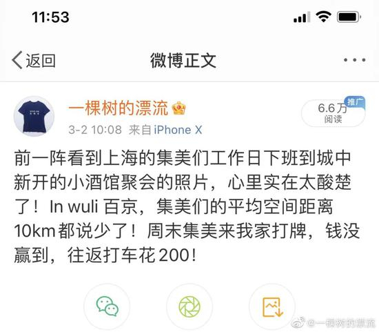 有人公司在西二旗,家住亮马桥。视觉效果上是横跨北京城东西两边,看似凄凉。