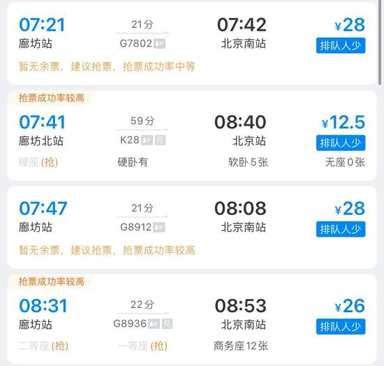 这样的人不是少数,而是成规模的:晚上11点,搜索次日从廊坊到北京的火车票,早上的车次基本都处于售罄状态。
