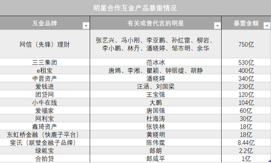 另据媒体不完全统计,与明星合作、代言的互联网金融产品还有网信(先锋)理财、三三集团、e租宝等14家,涉及明星至少28人,暴雷金额超2000亿元。