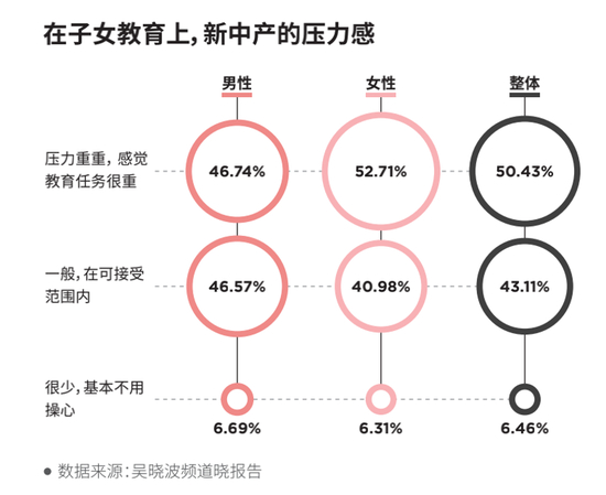 现实也是如此。《2020年新中产白皮书》的数据显示,男女教育焦虑的比例为4:6。而且当被问到对于教育有什么感受时,有一半的人表示自己压力重重,其中仍然是女性居多。