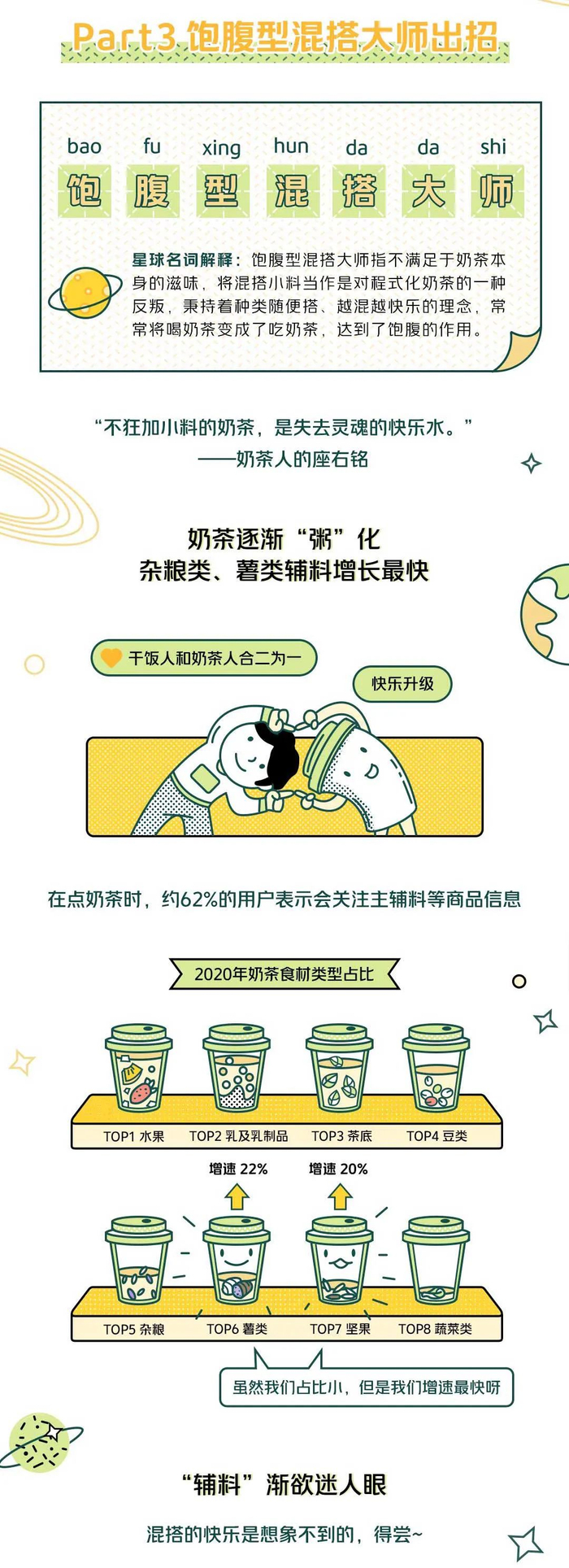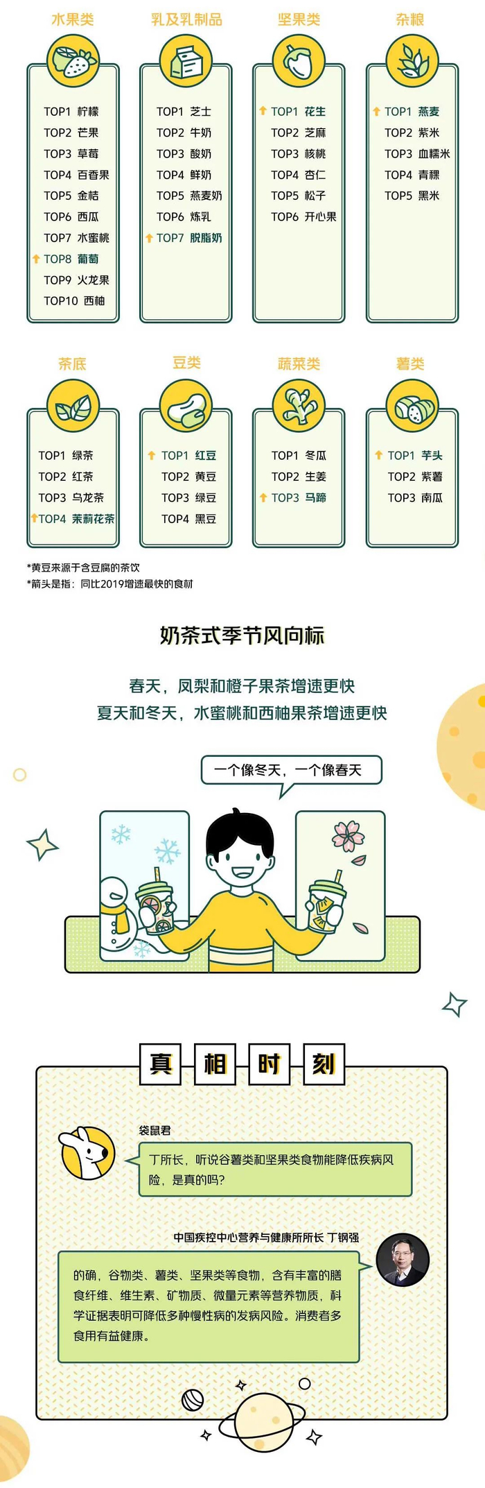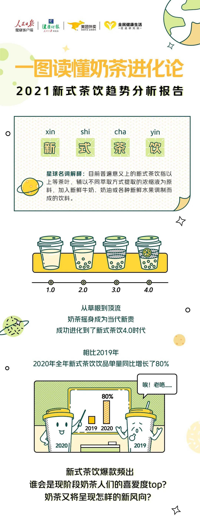 5月全民营养周期间,人民日报健康客户端、健康时报与美团外卖联合发布《2021新式茶饮趋势分析报告》。报告显示,2020年选择奶茶不加糖或代糖的用户明显增多,杂粮、薯类等多元化辅料成为新宠。
