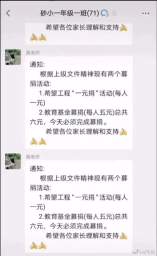 此前媒体报道引述家长的说法称,涉事学校5月16日组织一场捐款活动,建议每个学生的家长捐6元钱,第二天,有孩子忘记告诉家长就没有捐款。于是就出现了“教师让未参加捐款的学生排队录像,并将视频发至家长群中,请家长支持捐款”的荒唐一幕。