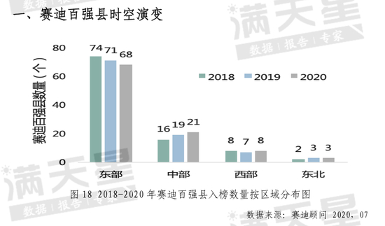 从整体排名与区域布局关联度来看,经济实力靠前的强县大多诞生在东部地区,中西部强县排名则相对靠后。以2020年为例,东部百强县达到68个,中部、西部、东北分别入围21个、8个、3个。