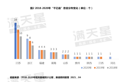 而从2018~2020年“千亿县“新增来源看,除了2020年河北新增1个“千亿县“外,其他10个“千亿县“均来自长三角的江苏和浙江。其中,江苏2019年、2020年分别新增3个,浙江2019年新增2个、2020年新增1个。
