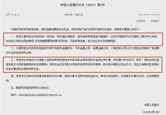 值得注意的是,今年3月底,央行发布公告要求,所有从事贷款业务的机构,在网站、移动端应用程序,宣传海报等渠道进行营销时,应当以明显的方式向借款人展示年化利率,并在签订贷款合同时载明。并明确,贷款年化利率应以对借款人收取的所有贷款成本与其实际占用的贷款本金的比例计算,并折算为年化利率。其中,贷款成本应包括利息及与贷款直接相关的各类费用。