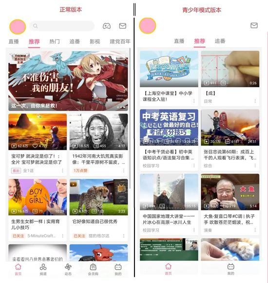 青少年模式下,B站变化较为明显。底部导览的首页、频道、动态、会员购、我的五个栏目,在青少年模式下仅保留首页、我的两部分。顶部的直播、推荐、热门、追番、影视等栏目,仅保留直播、推荐和追番三个栏目。直播功能完全关闭。推荐内容较为丰富,包括空中课堂、宠物、书法、摄影、美食等内容。在追番里,则仅限于观看固定的十几个动画内容。无论是之前关注的内容,均无法观看。此前收藏的内容可继续浏览。