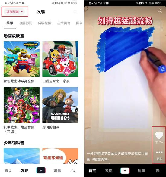 青少年模式下,家长需要先完善孩子年龄,平台将根据孩子年龄推荐不同的内容。抖音平台消息页面、发布页面无法展示,首页展示内容则多为手工、教育、百科、文化、动漫等内容,且无法看到视频发布者信息,此前的一些流量作品则不见踪影。