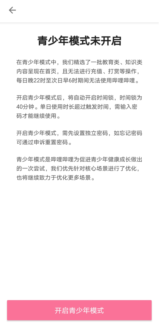 B站是作为青年群体常用的视频软件,因动漫视频丰富多彩,存在不少的未成年人用户,因此也推出了青少年模式。小商测试发现,B站的青少年模式在打开App时会自动弹出,且青少年模式下,B站用户每天使用超过40分钟即锁住,且晚上10点到早上6点之间不能使用。