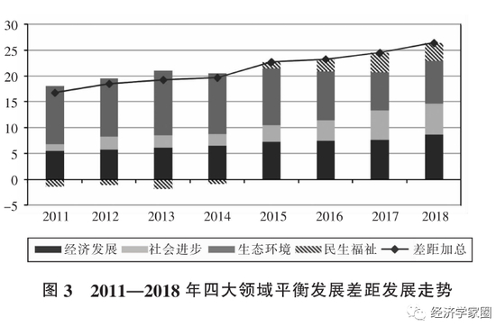 南北方地区在经济领域的平衡发展差距呈逐年扩大走势,2018年位列各领域之首。南北经济平衡发展差距由2011年的5.52增加至2018年的8.64,期间扩大了3.11(见图3)0 2017年开始,南北经济平衡发展差距超过南北生态平衡发展差距。南北民生平衡发展水平由北方地区占优转向南方地区领先。2011-2014年,南北民生平衡发展差距介于一1.81至一0.88之间,北方地区占据优势;2015-2018年,南北民生平衡发展差距介于1.21至3.74之间,南方地区领先〕南北方地区在生态领域的平衡发展差距呈缩小走势,但仍处于高位。2011年南北生态平衡发展差距为11.23 , 2013年增长至考察期的最高值 12.52 ; 2014-2018年,南北生态平衡发展差距由11.70下降至8.30,逐渐减小。社会领域的南北平衡发展差距快速上升。2011-2018年,南北社会平衡发展差距由1.37上升至6.04,增加了3.42倍。