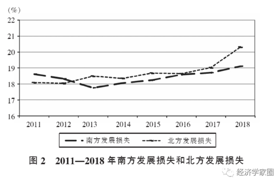(2)南北方地区内部不平衡均呈上升趋势,北方地区上升趋势更加明显。南北发展损失是对南北方地区内部不平衡性的综合度量。南方发展损失由2011年的18.61%下降至2013年的17.76% , 2014-2018年由18.06%上升至19.11%} 2011-2018年,发展损失上升了0.50个百分点。北方发展损失呈现波动上升的状态,由2011年的18.09%波动上升至2018年的20.32%。2011-2018年,发展损失上升了2.23个百分点(见图2)。此外,北方发展损失明显高于南方。2013年北方发展损失超过南方,且南北差距呈波动上升的走势。2013-2018年,北方发展损失平均高出南方0.51个百分点。这主要是由于北方地区仅京津地区整体发展水平较高,与其余省份的发展水平形成反差,导致内部较为严重的不平衡。城市和城市群的极化效应加剧了南北方地区内部发展的不平衡。由于长三角、珠三角和京津冀城市群三大传统引擎,以及成渝城市群等新增长极的崛起,南北方地区内部发展动力极化现象日益凸显,加速了南北方地区内部空间格局的分化。