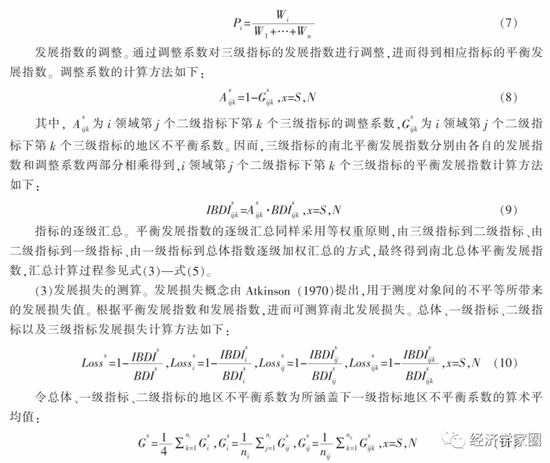 指标的逐级汇总。南北发展指数采取由三级指标到总体指数逐级加权汇总的方式,得到南北总体发展指数。采用等权重原则,即四个领域、同一个领域的二级指标、同一个二级指标下的三级指标赋予相同的权重。在逐级汇总过程中,二级指标为对应三级指标的算术平均值,一级指标为对应二级指标的算术平均值。令S,N分别表示南方、北方地区,南北总体平衡发展指数计算过程如下: