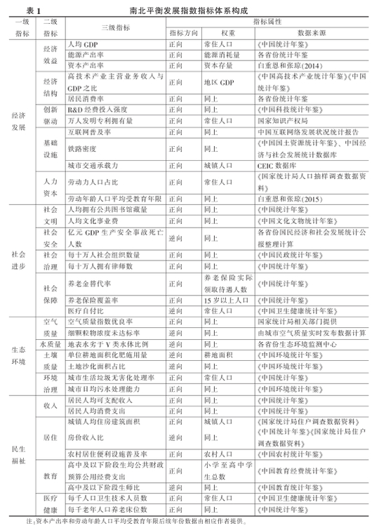 “不平衡不充分’,是针对日前中国各方面发展现状与人民对美好生活需要之间存在差距提出的。社会主义制度的发展和完善是一个长期的历史过程,社会主要矛盾也会发生转变。党的十一届六中全会提出,现阶段社会主要矛盾是“人民日益增长的物质文化需要同落后的社会生产之间的矛盾”。经过二十多年的改革开放,中国社会生产力取得巨大发展,人民物质生活得到极大满足,进而党的十八大正式确立了“全面建成小康社会’,的目标。党的十九大提出中国社会主要矛盾转化为“人民日益增长的美好生活需要和不平衡不充分的发展之间的矛盾”。人民对美好生活的需要既要涵盖教育、医疗、养老、就业、住房等民生层面的需要,还包含社会文明、社会安全、社会公平,以及治理空气污染、土壤污染、水资源污染、优化环境等社会与生态环境需要。因此,南北平衡发展指数是在人民美好生活需要的内涵框架下对南北方地区发展不平衡不充分程度的全方位定量刻画,是以经济发展为前提,以社会进步和生态环境为保障,最终落脚于更好地保障和改善民生福社。