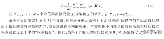 地区不平衡系数的测算。人类发展指数通过计算各指标值的算术平均与几何平均之比刻画不平等程度(UNDP, 2017 ),该方法源于Atkinson (1970)提出的不平等测度。本文借鉴这一思路,但关于地区不平衡的测度方法分别尝试采用基尼系数法、分位数法和相对平均偏差法等。在对比不同方法对各指标分组数据的计算结果后,本文选择结构表达相对适中的基尼系数法①。离散数据下基尼系数的平均差公式如下: