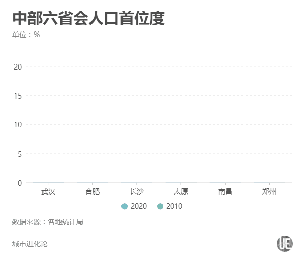 一方面,郑州的“人口首位度”已从2010年的9.17%提升至2020年的12.68%,但同时,这一数值在中部六个省会中排名最末,武汉的“人口首位度”达到21.34%。