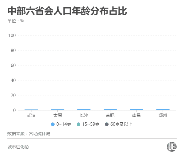 虽然武汉的劳动年龄人口占比达到69.72%,领跑中部六城,但其60岁及以上人口比重达到17.23%,老龄化程度最深,而0~14岁人口比重仅为13.05%,在六城中占比最低。
