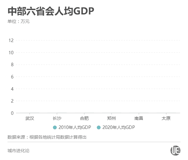 2010年,中部六个省会城市的人均GDP排名依次为长沙、武汉、郑州、南昌、太原、合肥;2020年,这一位次调整为武汉、长沙、合肥、郑州、南昌、太原。