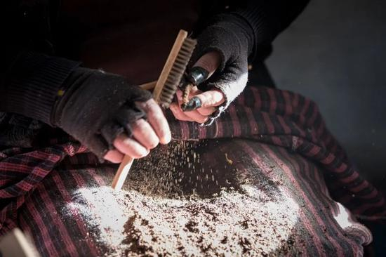 市场中除了虫草的交易双方外,还延申出一个“配套”的群体——刷土者。她们都是年纪稍大的妇女,三五人坐在一起,每人手中持一把钢丝刷,刷子高频地刷向裹着泥土的虫草。不消几秒,之前的“泥棒子”就成了颜色黄亮的鲜虫草。