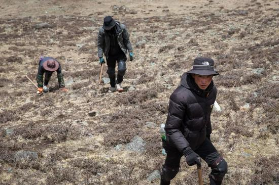 他们采挖虫草的过程,可以总结成几个动作。一趴二寻三招手,四下板镢五装盒。