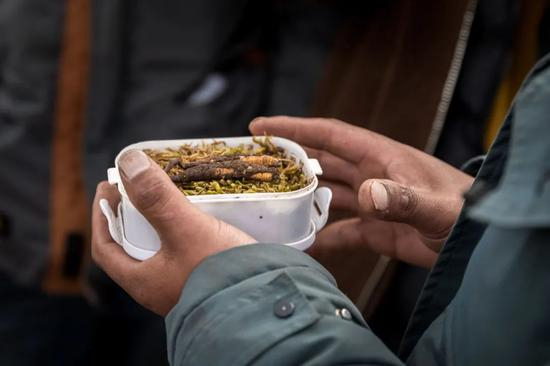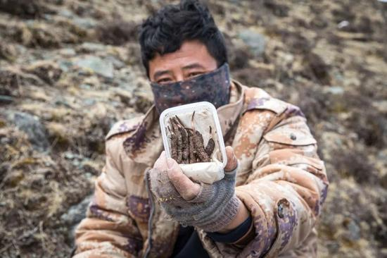 “草民”把当天挖出来的虫草小心翼翼地放在肥皂盒里