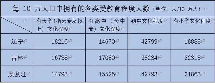 10年来,东北地区的人口素质不断提高。2020年全国第七次人口普查数据显示,拥有大专及以上文化程度的人口占总人口的16.75%,与2010 年第六次全国人口普查相比,东北地区15岁及以上人口平均受教育年限为由9.51年提高至10.16年。这两个数据反映东北地区人口受教育程度的指标,都是高于全国平均水平的。