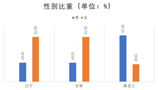 在31个省份中,总人口性别比(以女性为 100,男性对女性的比例)在100至105之间的省份有17个,在105至110之间的省份有9个,在110以上的省份有3个,在100以下的省份只有2个,即辽宁省、吉林省,数据显示这两个省出现“女多男少”的现象。辽宁男性人口的比重为49.92%,女性人口比重为50.08%,性别比为99.70%,吉林男性人口的比重为49.92%,女性人口为50.08%,性别比为99.69%,黑龙江男性人口的比重为50.09%,女性人口为49.91%,性别比为100.35%。