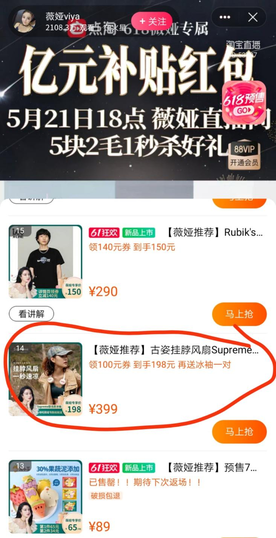5月14日,带货女王薇娅正常开播卖货。当日的产品列表中,一款名为“古姿挂脖风扇Supreme联名”的商品,售价198元,在直播间开卖。