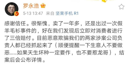 今年5月,罗永浩在微博表示:很惭愧,卖了一年多,还是出过一次假羊毛衫事件的,好在我们发现后立即对消费者进行了三倍赔付。目前恶意欺骗我们的两家涉案公司负责人都已经抓起来了。