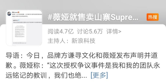 随后,“薇娅就售卖山寨Supreme联名商品道歉”一事,冲上了微博热搜,阅读量达4.7亿。