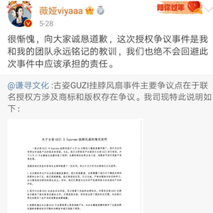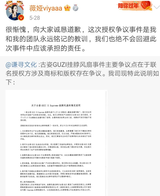 5月28日,薇娅所属公司谦寻文化发布说明称,经过核查,该产品存在授权争议,向公众致歉,薇娅本人也转发该说明道歉,并表示“这是永远铭记的教训。”另一品牌方古姿官方微博也发表致歉声明。