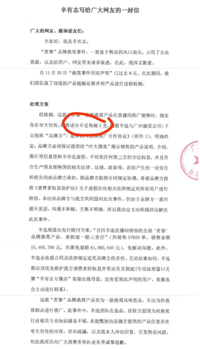 最终,辛巴团队在微博上对此次燕窝事件道歉,承认该产品中燕窝成分每碗不足2克,存在夸大宣传的成分,承担假一赔三的责任。