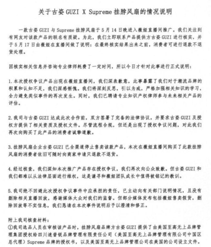 这几日,“直播一姐”薇娅因在直播间售卖“古姿与Supreme联名风扇”,被网友爆出该产品为山寨货。