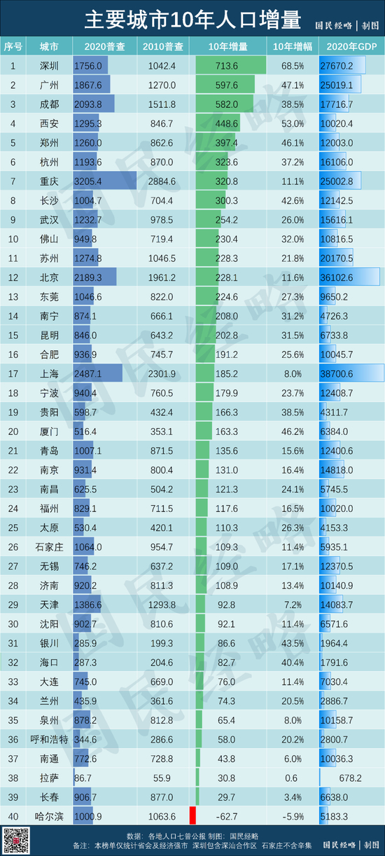 从城市来看, 深圳、广州、成都三城霸榜,10年人口增量分别高达713.6万、597.6万、582万,相当于一个南昌或两个海口的总人口规模。