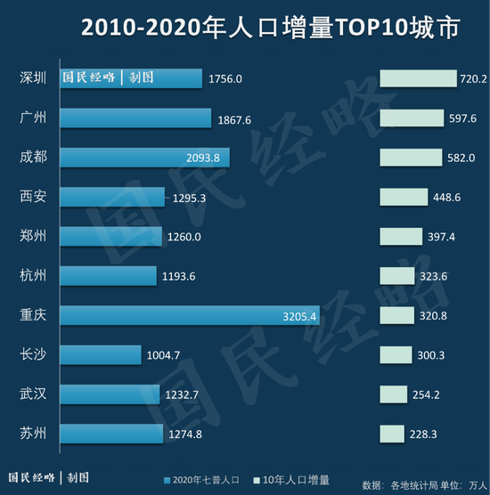 由于各大城市人口基数不同,由此导致人口增幅大相径庭。从过去10年人口走势来看,人口增量、人口增幅双双位居前十的城市只有6个:深圳、西安、广州、郑州、长沙、成都。