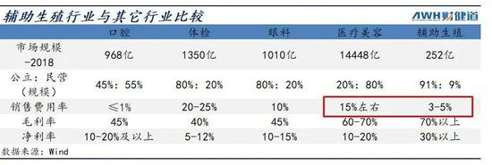 与口腔、体检、眼科、医美等相比,辅助生殖行业的销售费用更低,净利润水平更高,主要原因在于其对外部营销中介依赖较少。相同水平的医疗美容行业与辅助生殖行业,医美的销售费用率达到 15%,辅助生殖仅为3-5%。