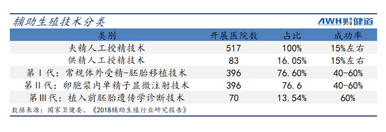 不孕不育的治疗路径主要有 3 类:常规药物治疗、手术治疗、辅助生殖技术治疗。当经过药物和手术治疗后仍无法实现自然受孕时,辅助生殖是不孕不育的最终诊疗手段。辅助生殖由两种技术组成:人工授精和体外受精-胚胎移植(IVF-EF)。体外受精即为人所熟知的“试管婴儿”,妊娠率能够达到50%左右,远超其他治疗手段。
