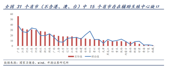 根据《人类辅助生殖技术配置规划指导原则》,每 300 万人应规划设立一家辅助生殖中心,然而现存数据显示,全国有15 个省市存在配置缺口。人口大省之一四川缺口最多,达到 15 家,安徽缺口 7 家,甘肃缺口 5 家。相反,一线城市和经济更发达的东部、南部地区存在超配的情况,其中,广东超配18 家,北京、上海超配 11 家。