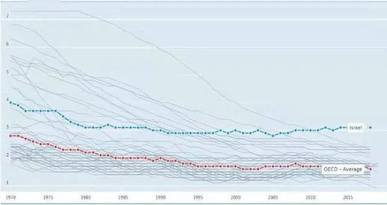 1970年至2019年以色列与OECD国家平均生育率趋势比较(来源:经合组织)
