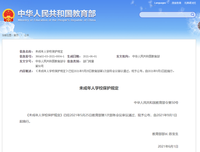 《未成年人学校保护规定》已经2021年5月25日教育部第1次部务会议审议通过,现予公布,自2021年9月1日起施行。