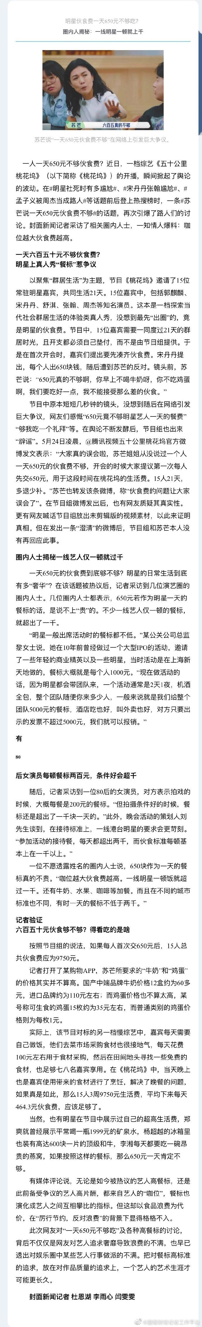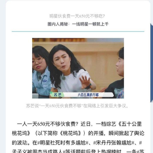 一人一天650元不够伙食费?近日,一档综艺《五十公里桃花坞》开播,#苏芒说一天650伙食费不够#的话题引发热议。@封面新闻 记者采访了相关圈内人士,一知情人爆料:咖位越大伙食费越高。几位圈内人士都表示,650元若作为明星一天的餐标的话,是说不上“贵”的。不少一线艺人仅一顿的餐标,就超出了一千。