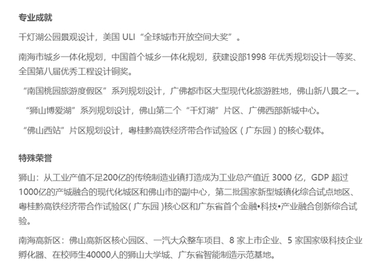 蕾奥规划官网显示,王雪在佛山政府任职期间专业成就显著。他不仅获得多项城市规划设计获奖,更是将狮山从工业产值不足200亿的传统制造业镇打造成为工业总产值近3000亿,GDP超过1000亿的产城融合的现代化城区和佛山市的副中心。