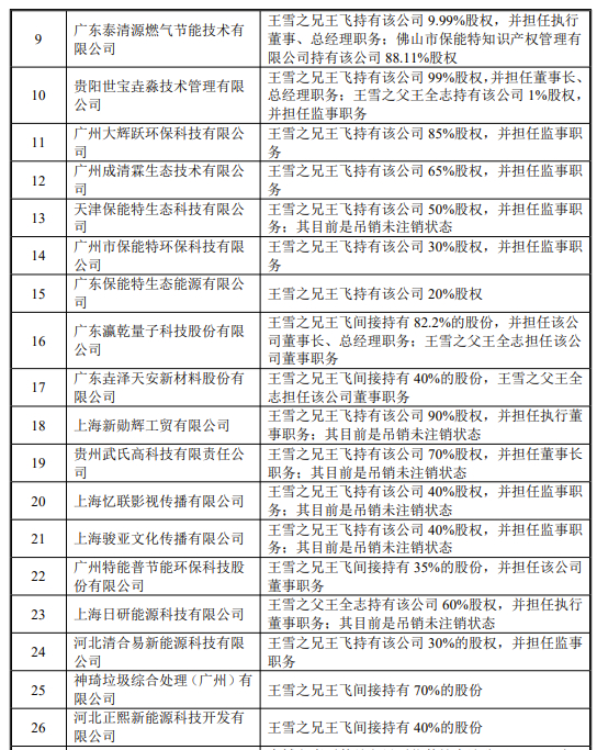 招股说明书显示,王雪父兄持有多家公司股权。仅在佛山市就持有佛山市保能特知识产权管理有限公司、佛山保能特能源材料有限公司、佛山市保能特能源发展有限公司。