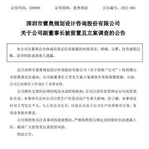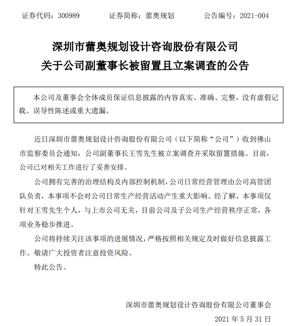 5月31日晚,上市公司蕾奥规划发布公告称,收到佛山市监察委员会通知,公司副董事长王雪被立案调查并采取留置措施。