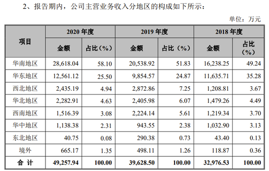 公司的业务主要集中在华南地区,集中度逐年增加。根据招股说明书显示,2018年至2020年,公司在华南地区收入为1.6亿元、2.1亿元、2.9亿元,占比为49%、52%、58%。