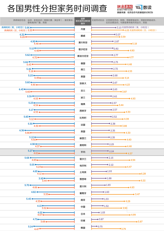 同时,很多女性还要花大量时间在家庭上。中国男生在分担家务方面,是世界上最少的国家之一。