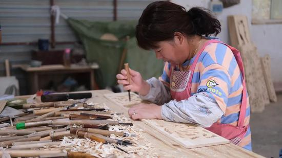 相比之下,车间到12点仍不间断的缝纫声、一分钟能绣1500针的绣花机器声、快递点分拣快递、木雕厂工人打磨、凿木的声音,似乎才是属于曹县的声响。