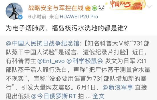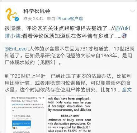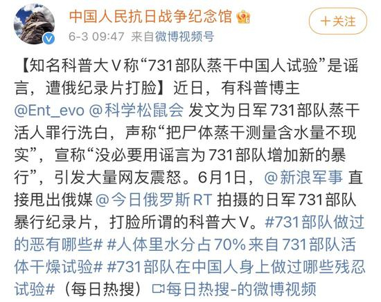 但随后微博粉丝高达425万的科普大V、科学松鼠会成员@Ent_evo 发文“辟谣”称,“把尸体蒸干测量含水量不现实”,宣称“没必要用谣言为731部队增加新的暴行”,这一言论随后引起大量网友震怒,质疑其在偷换概念,实则“为暴行洗地”。