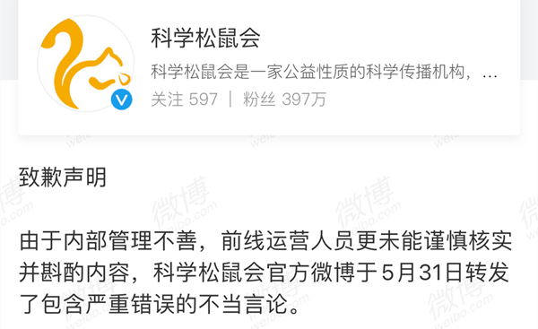 其实翻车第二天,也就是6月1日,@科学松鼠会曾经发过一条道歉博文。