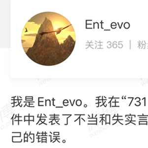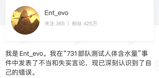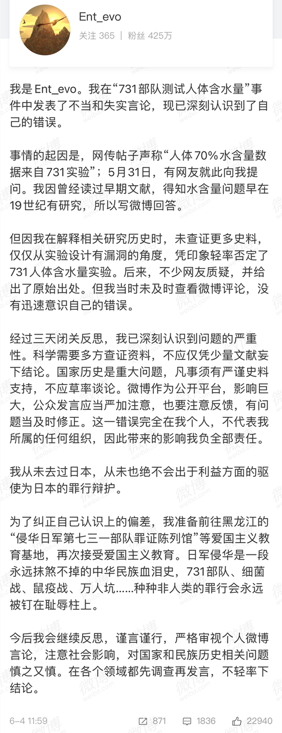 @Ent_evo 称自己在此事件中,未经多方查证资料就妄下结论,仅仅从实验设计有漏洞的角度,凭印象否定了日军731部队人体含水量实验。他还表示,经过三天闭关反思,自己已深刻认识到问题的严重性,对此次事件带来的影响负全部责任。