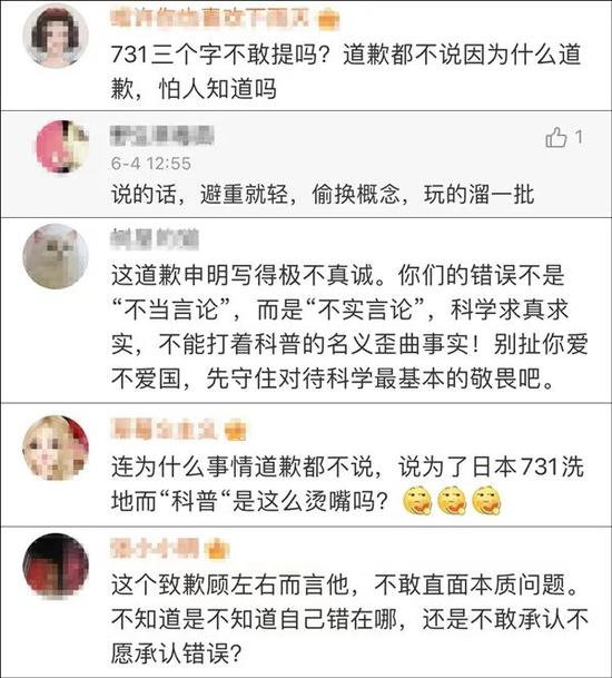 然而@科学松鼠会 的这封致歉声明中,通篇没有提及“731部队”,因此再被网友指责在原则问题上避重就轻,道歉态度不真诚。